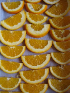 Pre-heat oven to 110°C/250°F. Cut the oranges in half lengthways and then slice thinly (about 3 mm thick) as bellow.