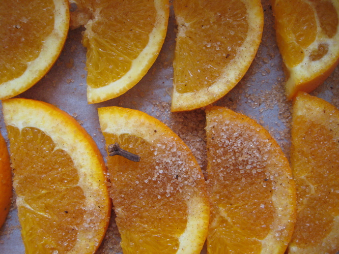 Toss the oranges in a bowl along with the sugar and spices until evenly covered. Carefully place on a baking tray lined with baking paper and pop in the pre-heated oven until the rind becomes brittle and dry. About 2 hours, however this will vary considerably depending on your oven.