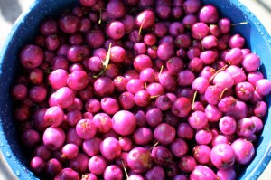 The Lilly Pilly has become a somewhat popular garden ornamental here in Melbourne. A beautiful dense green rainforest tree native to coastal Australia with white flowers that turn into deep pink berries. It was with little surprise that a friend and I spotted a heavy laden tree on the side of the road on an afternoon walk. A convenient plastic bag stuffed in a pocket for just such an occasion made a perfect vessel to carry the fruits home once picked.
