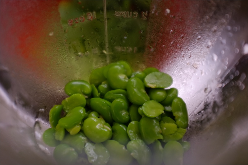 Cook the peas and beans in boiling water for no more than two minutes, drain and rinse in cold water immediately. Pull the outer skin of each podded broad bean – and puree all ingredients together.