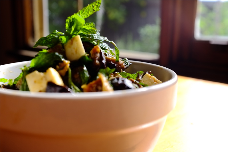 The recipe below for an eggplant and zucchini salad spiced with paprika, cumin and mint, is both light and rich. The dried figs, walnuts and fetta add a lovely texture to the softness of the roasted vegies.