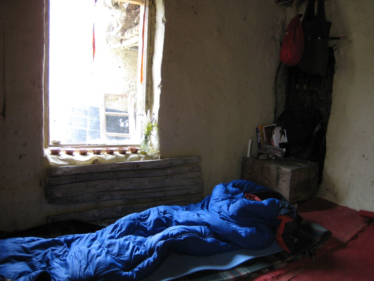 My room is also made of mud and cow dung, a little square that I can just lie down in. It has a small window and a small door I have to double over in to enter. When it is windy the roof sprinkles dirt to the floor. The scene from my window is vivid. At dusk small birds with round bellies and orange tails sit outside and I try to be very quiet then, any movement and they will fly away. As night draws, the moon illuminates the land with a pale yellow grey light and the shadows of the clouds play on the mountain tops.