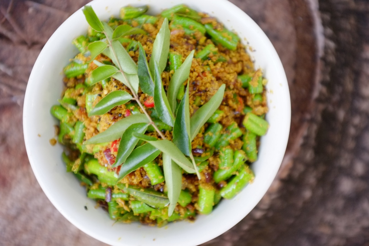 In a wok heat the oil on a medium to high flame until hot. Add the mustard seeds, turmeric, onion, and salt. Stir until the onions turn just translucent, then add the chilli and lentils. Continue stirring and add the beans and coconut stirring until the beans are just cooked through but still have a crunch and are bright green. Add the curry leaves and remove from heat.
