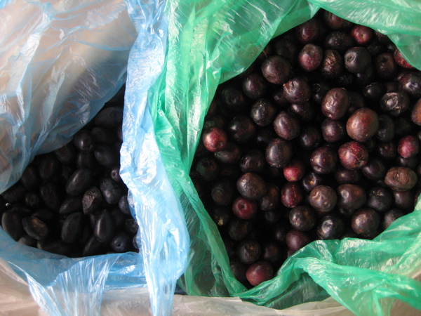 Sterilize a bunch of big jars. Wash the olives thoroughly and place in the jars. Cover with briny water (100 g salt dissolved per 1 litre water). Then pour a layer of olive oil on the top of the water and seal tightly. The fuller the better, as the less air inside the jar, the less likely they will contaminate. Leave in a dark cool place for about 3 – 4 months or until they develop a rich olive flavour. A layer of scum will develop at the top of the jar, however this is said to be helpful in taking away the bitterness of the olives.