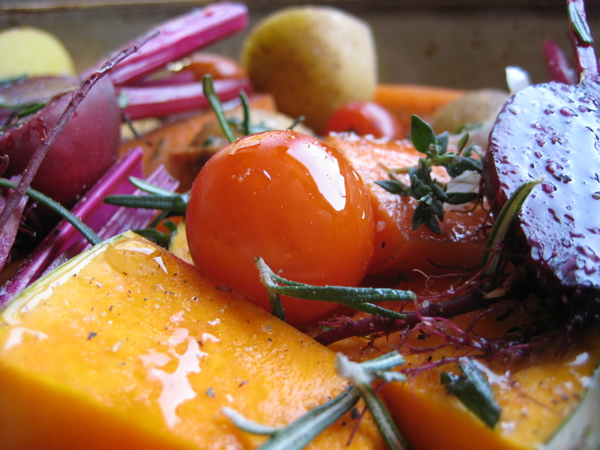 Without enough to make a meal of them, here is what I did. Popped them in a tray with pumpkin, sweet potato, carrots, cherry tomatoes, garlic, fresh thyme and rosemary. Sprinkled them with salt, a generous helping of olive oil and a dash of balsamic vinegar. And into the oven at 200°C/390°F they went.