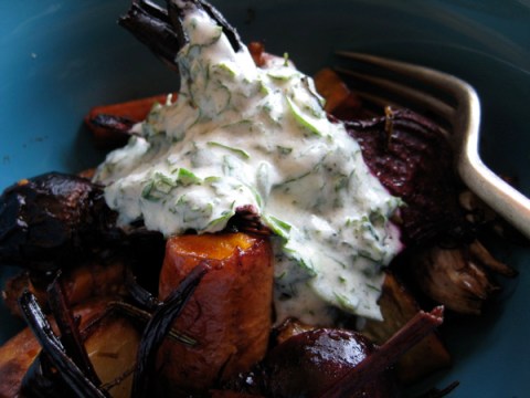 I stirred together a handful of chopped coriander, some mint, 2 tablespoons yoghurt, a dash of olive oil, salt and pepper to taste and served it with the vegies.