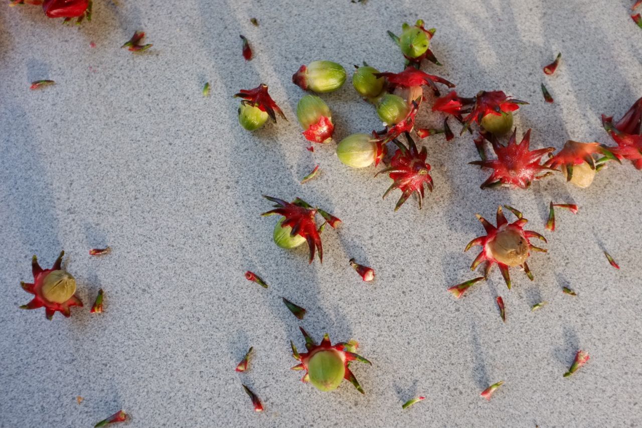 I found these at the markets the other day. I have been told you can turn them into jam, cordial, champaigne ornamentals, or a surprise in a loaf of bread. But from the sounds of it, and from the very small nibble I had, they are best drenched, soaked, or boiled in sugar. Their magic is that when wet they unfurl, like little aliens stretching out their arms staining everything red. As you may have gathered, I made jam. Its cooling in jars on the bench as we speak.